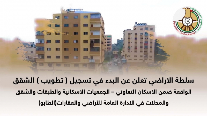 اعلنت سلطة الاراضي عن البدء بإجراءات تسجيل الشقق السكنية التابعة لنظام الاسكان التعاوني " الجمعيات الاسكانية " وفقاً للإجراءات المنصوص عليها في قرار لجنة متابعة و المعمول بها في سلطة الأراضي