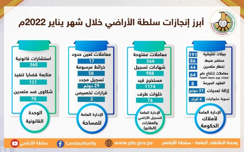 التقرير الشهري انفوغرافيك - أبرز انجازات سلطة الأراضي خلال شهر يناير 2022 02 مارس, 2022 Share Tweet 988