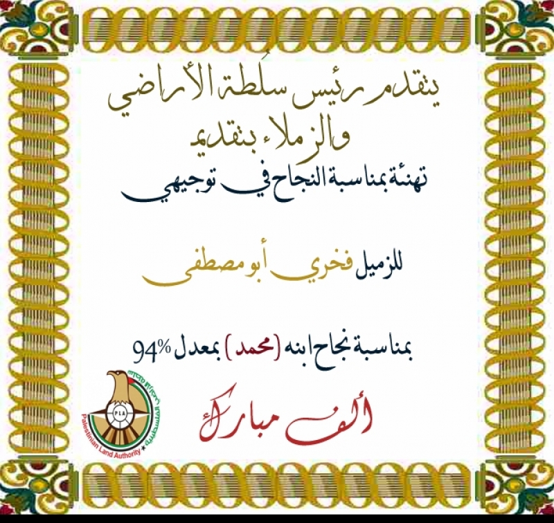 اجتماعيات تهنئة بمناسبة نجاح بتوجيهي للطالب محمد فخري أبو مصطفى تهنئة بمناسبة نجاح بتوجيهي للطالب محمد فخري أبو مصطفى 06 يوليو, 2015 Share Tweet 1801