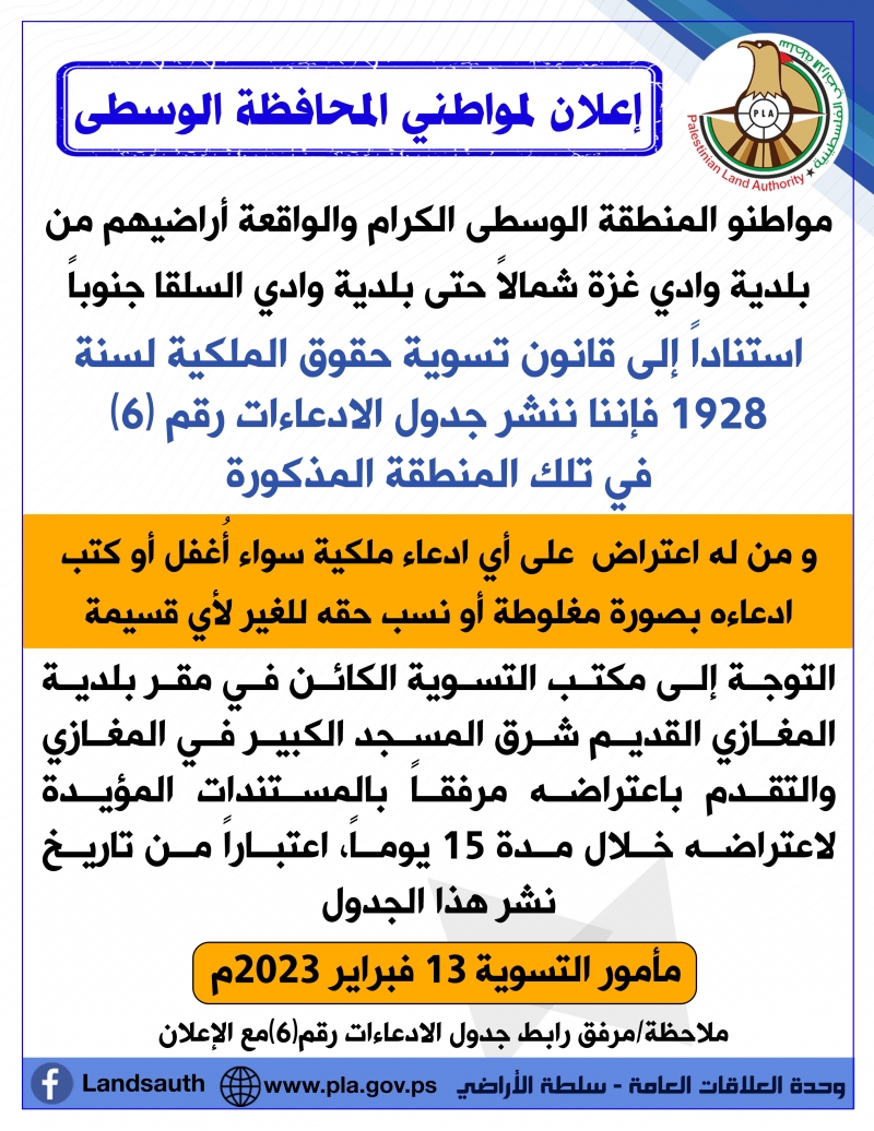 اعلانات جدول الادعاءات رقم (6) لمشروع التسوية الشاملة لحقوق الملكية 13 فبراير, 2023 Share Tweet 1114 رابط جدول الادعاءات رقم 6