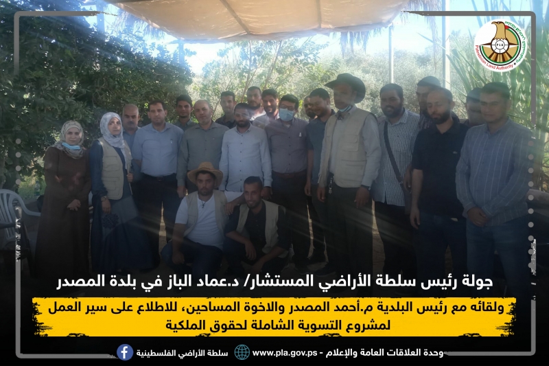 جولة لرئيس سلطة الأراضي المستشار/ د.عماد الباز في بلدة المصدر، ولقائه مع رئيس البلدية م.أحمد المصدر والاخوة المساحين، للاطلاع على سير العمل لمشروع التسوية الشاملة لحقوق الملكية .