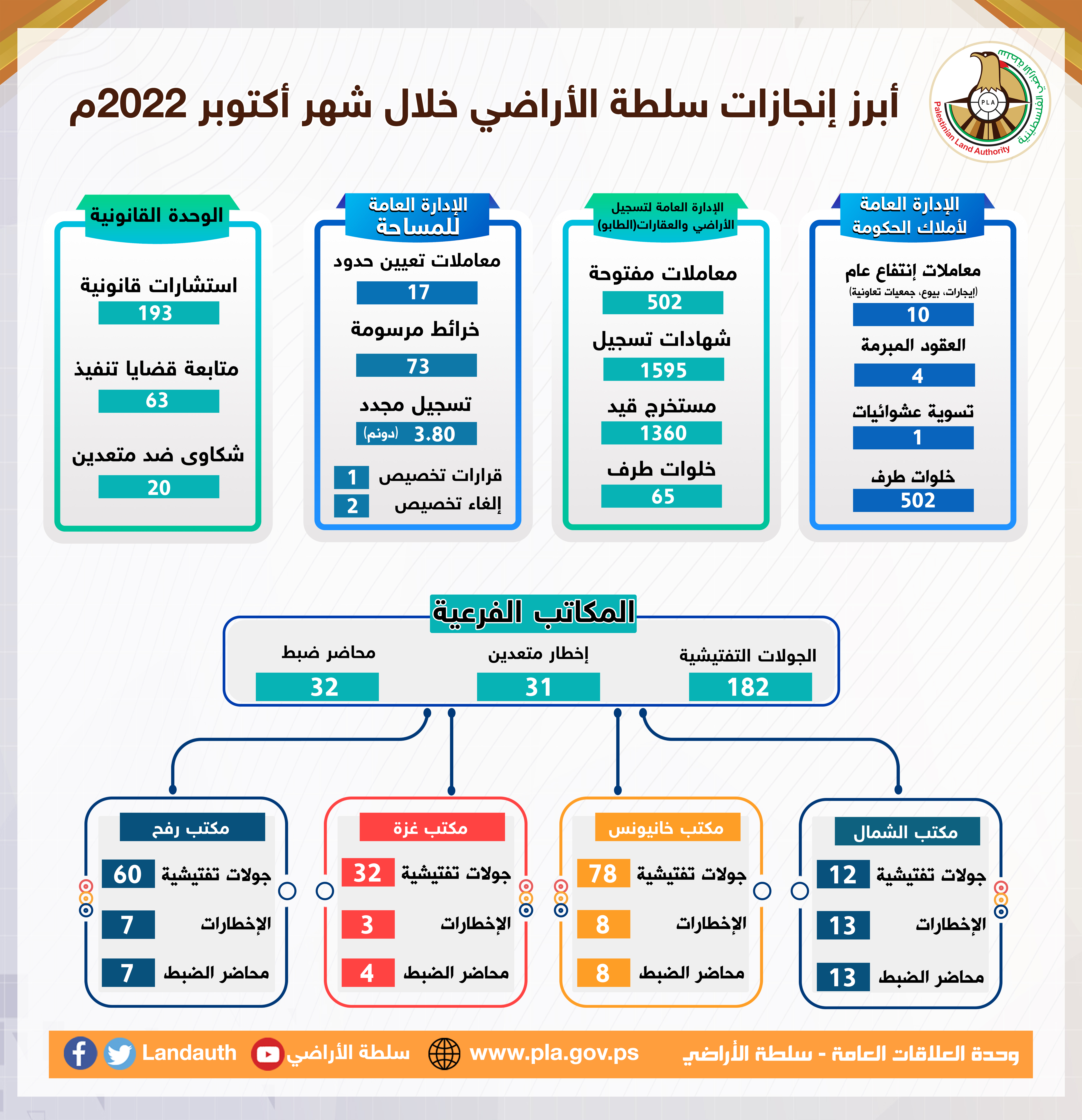 " انفوجرافيك " التقرير الشهري لإنجازات سلطة الأراضي خلال شهر أكتوبر الماضي من العام الجاري 2002
