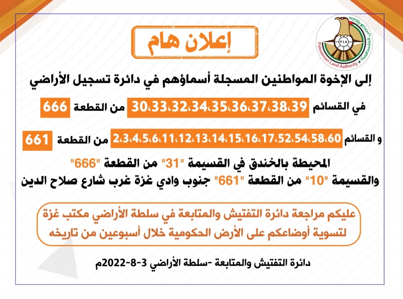 إعلان مهم صادر عن سلطة الأراضي