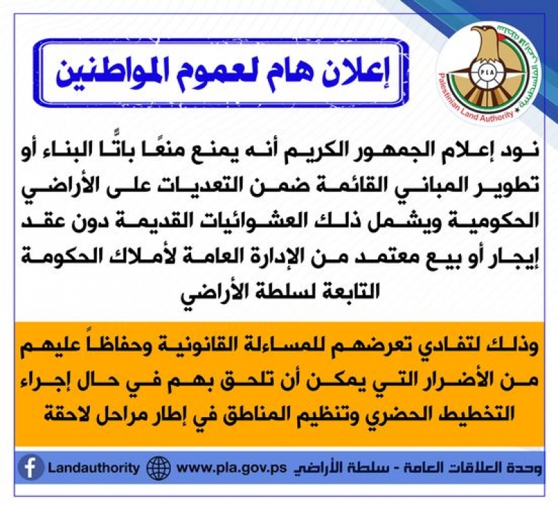 اعلانات إعلان للمواطنين بمنع البناء في العشوائيات القائمة ضمن التعديات على الأراضي الحكومية 20 أبريل, 2022 Share Tweet 884