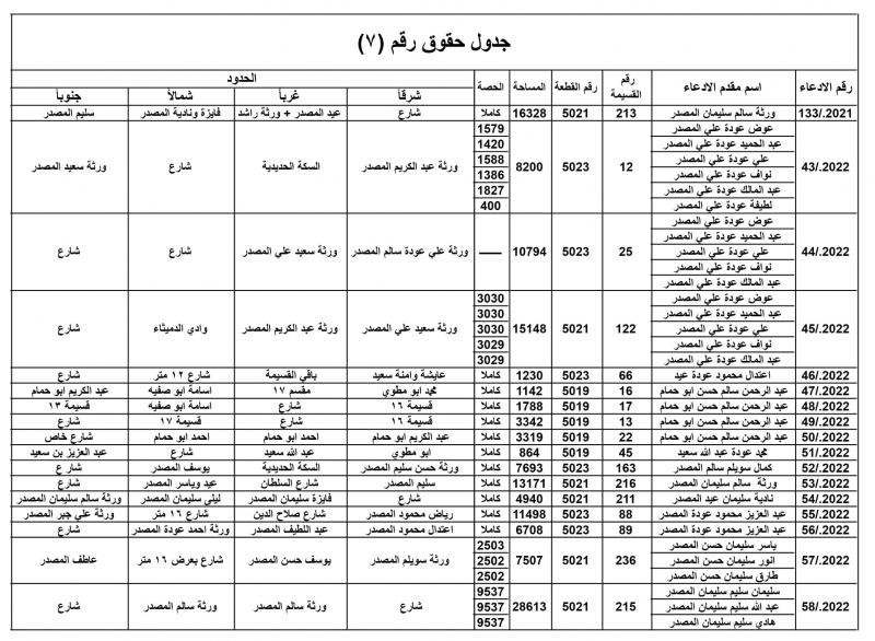 جدول الحقوق رقم (7) الخاص بمشروع التسوية لمنطقة المصدر