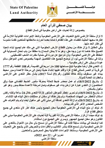 بيان صحفي للرأي العام بخصوص إزالة تعديات على أراضٍ حكومية في شمال القطاع